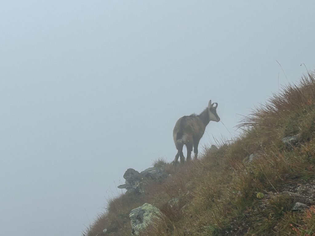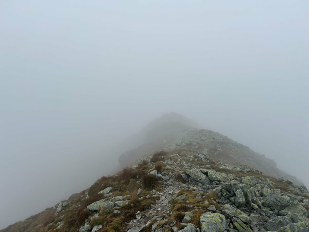 Szybko zbiegam na Niską Przełęcz (1831m n.p.m), po drodze mijam kilka kozic, i zaczynam podejście na Jarząbczy Wierch. Jest ono dosyć wymagające kondycyjnie, gdyż na niecałym kilometrze, trzeba zrobić 300m w pionie. Na szczycie (2137m n.p.m.) odbijam na zielony szlak, na boczną grań Otargańców i podbiegam na Jakubinę (2194m n.p.m.) – drugi co do wysokości szczyt Tatr Zachodnich. Całą tą grań mam w planach na przyszły sezon, dziś robię tylko lekkie rozeznanie tematu. Jest bezwietrznie, a przez to ciepło, jednak brak wiatru oznacza, że chmury się nie przesuną i… widoków dalej brak. Na Jakubinie spotykam dwóch biegaczy, chwilkę rozmawiamy, po czym wracam na Jarząbczy i biegnę dalej czerwonym, szlakiem na Kończysty Wierch (2002m n.p.m.) i Starorobociańską Przełęcz (1958m n.p.m.). Na przełęczy sprawdzam po raz ostatni prognozę pogody, szanse na widoki dalej są, ale bardzo niewielkie.