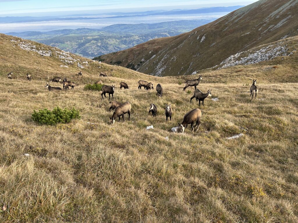 Co prawda rozważałem podejście na Giewnot, ale pomimo wczesnej pory, ilość ludzi, która właśnie tam się udawała, skutecznie odwiodła mnie od tego pomysłu. Skręcam więc na żółty szlak i obieram kierunek na Kopę Kondracką (2005m n.p.m.) – pierwszy z czterech wierzchołków Czerwonych Wierchów. Jesienią, porastająca zbocza tych gór roślina o nazwie sit skucina, barwi się na czerwono, stąd nazwa „Czerwone Wierchy”. Mijam Kopę, dalej Małołączniak (2096m n.p.m.) i zbiegam na Litworową Przełęcz. Na przełęczy, w ogóle nieskrępowane obecnością turystów, pasie się spore stado kozic. Naliczyłem ponda dwadzieścia!